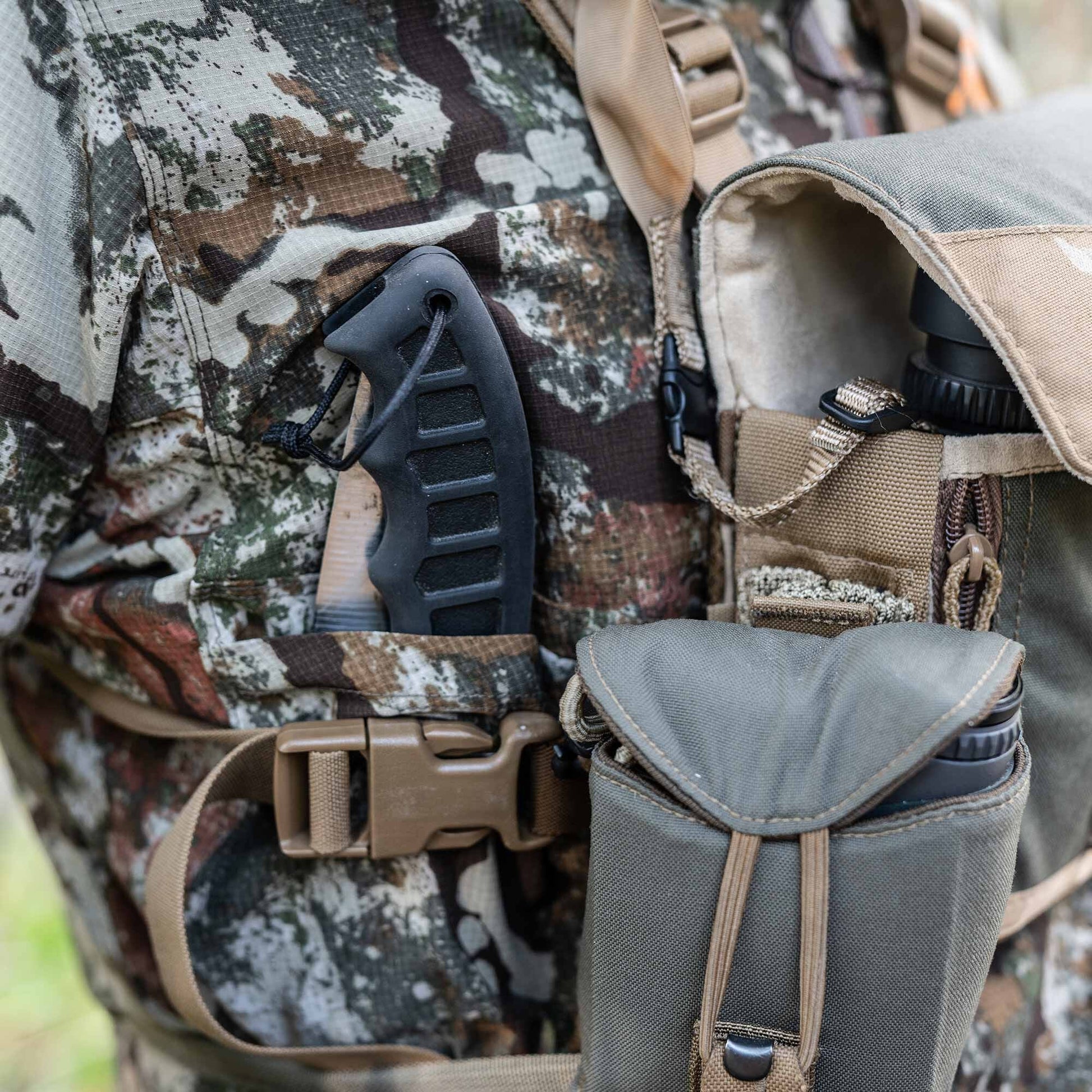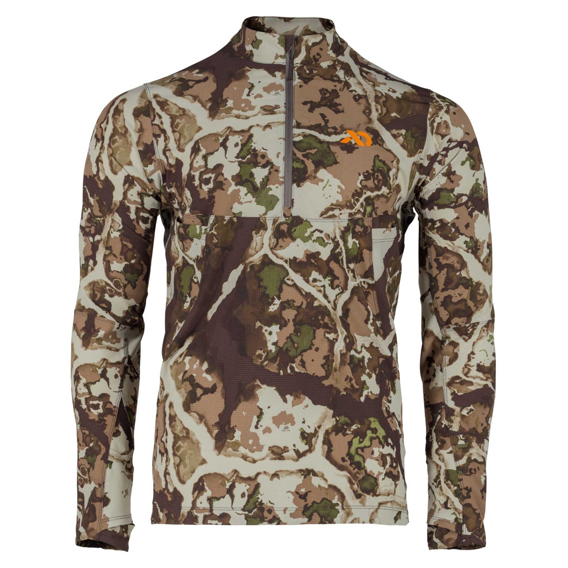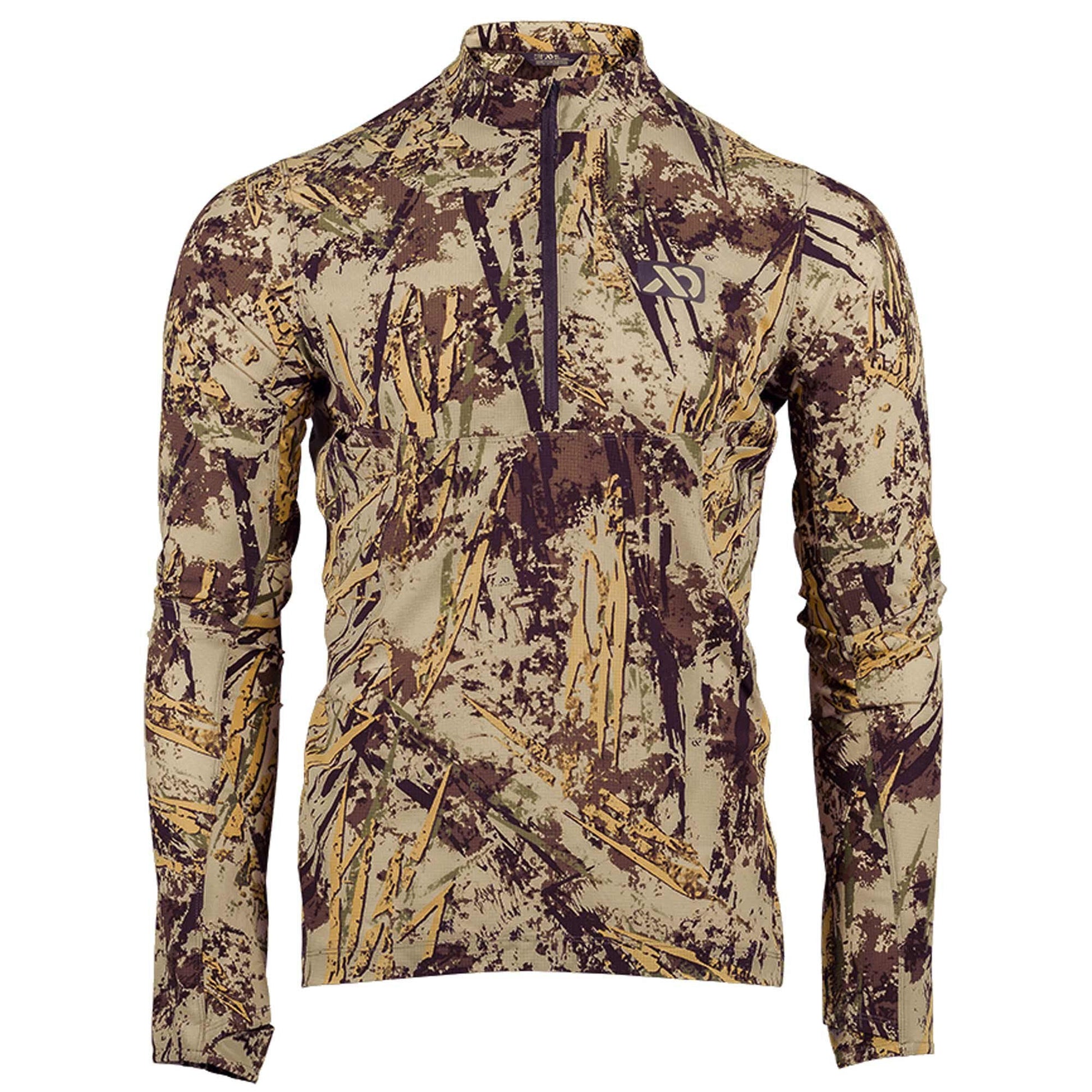 The Trace Quarter Zip features a low-profile collar for protection from the sun and bugs. Additionally, the deep quarter zip allows for maximum ventilation. Dual side-dump pockets on the chest remain accessible with the use of a binocular harness for quick, easy, and accessible gear/phone storage. The integrated thumb loops provide concealment and prevent bunching or sliding up of your sleeves when adding or removing layers.